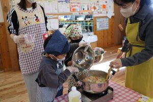 野菜やお肉を切ったり、お鍋で炒めたりとお母さんと一緒に頑張りました☺️☺️